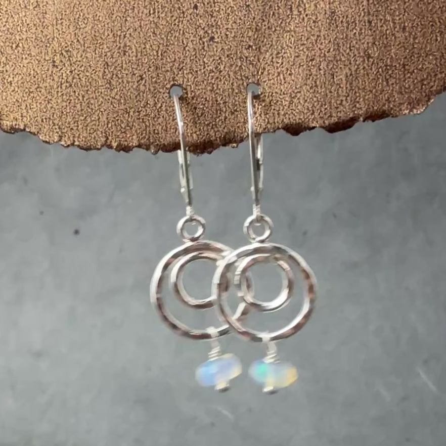 These dainty circular dangles are hand-forged and hammered for subtle sparkle. Featuring beautiful natural opals with a light golden glow and brilliant multi-colored flash. Paired with elegant standard earwires or hinged lever-back earwires, all in solid sterling silver for long lasting quality. The opals will vary slightly in color with hints of purple, green, blue or pink.