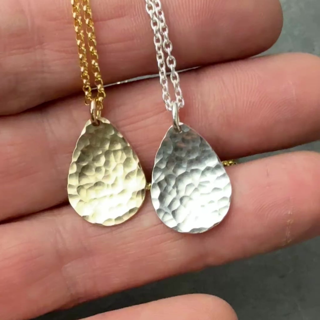 Your new everyday staple necklace, perfect for layering. Each teardrop is punched out from sheet metal, drilled, hammered by hand and polished, making every necklace is one of a kind. Crafted from high-quality sterling silver or 14K gold filled metal, and paired with my favorite dainty but sturdy chain.