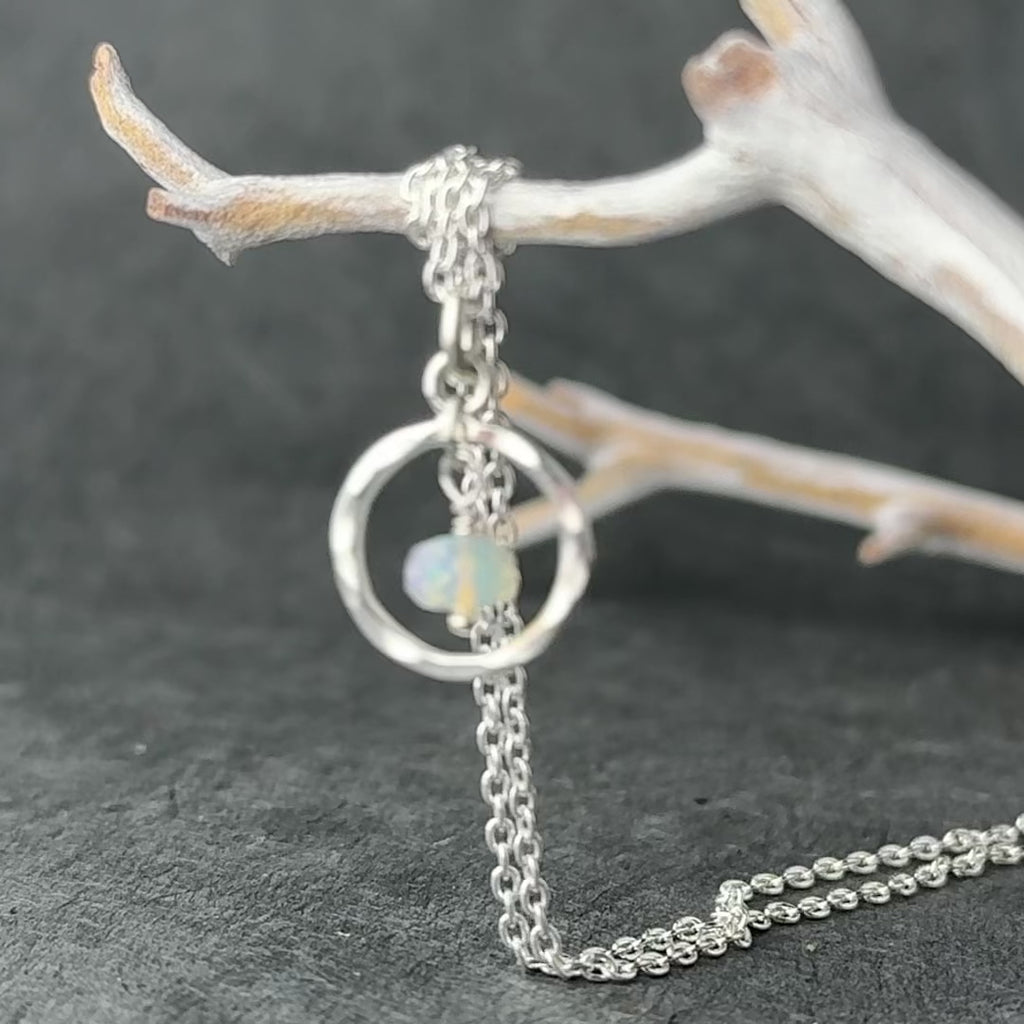 A beautiful faceted opal is paired with a hand forged hammered sterling silver circle pendant. Featuring beautiful natural opal with a light golden glow and brilliant multi-colored flash. The opals will vary slightly in color with hints of purple, green, blue or pink. Paired with my favorite dainty but strong sterling silver cable chain.