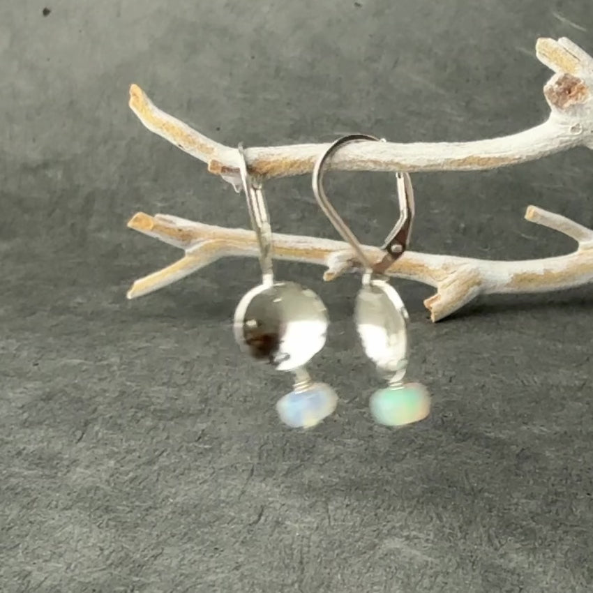 Dainty tiny silver discs are hammered and domed, then paired with beautiful natural opals with a light golden glow and brilliant multi-colored flash. Choose from elegant standard earwires or hinged lever-back earwires, all in solid sterling silver for long lasting quality. The opals will vary slightly in color with hints of purple, green, blue or pink.