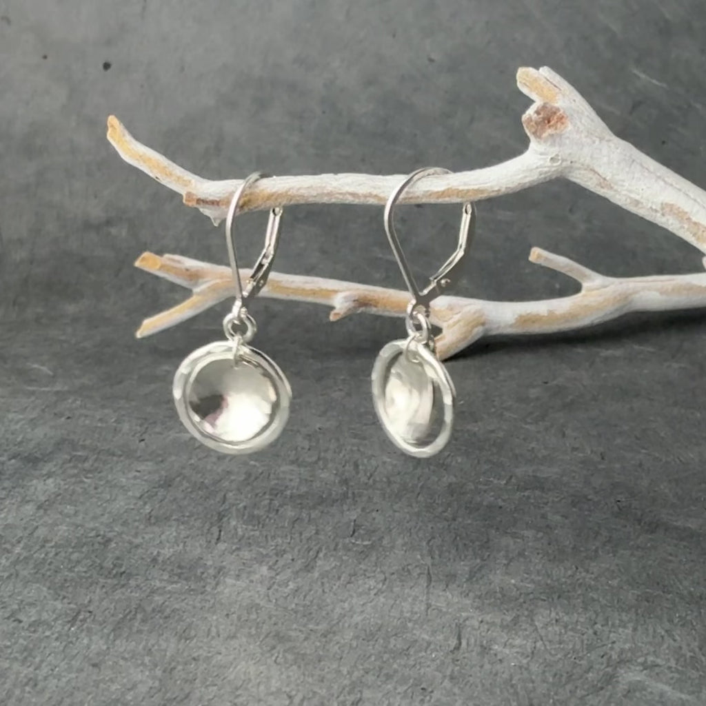 These handcrafted earrings showcase mini domed discs that are hammered and paired with hand forged circles. Made with love and care in my Alaska studio, these dainty beauties are perfect for those who love petite, lightweight, minimalist jewelry. Created with solid sterling silver metal for long-lasting quality. Choose from traditional standard earwires or popular hinged lever-backs.